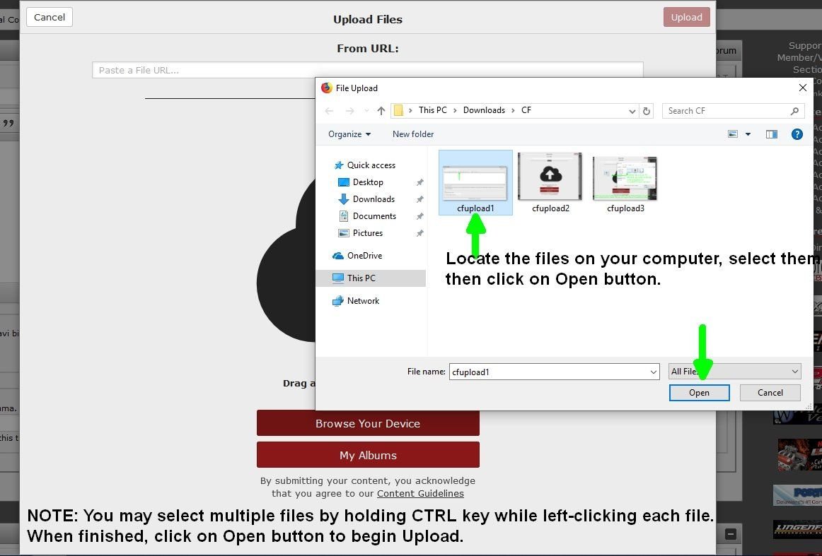 NOTE: You may select multiple pictures by holding CTRL key and then selecting each file. Once finished selecting, use Open button to begin the Upload. You may also drag and drop files between windows.