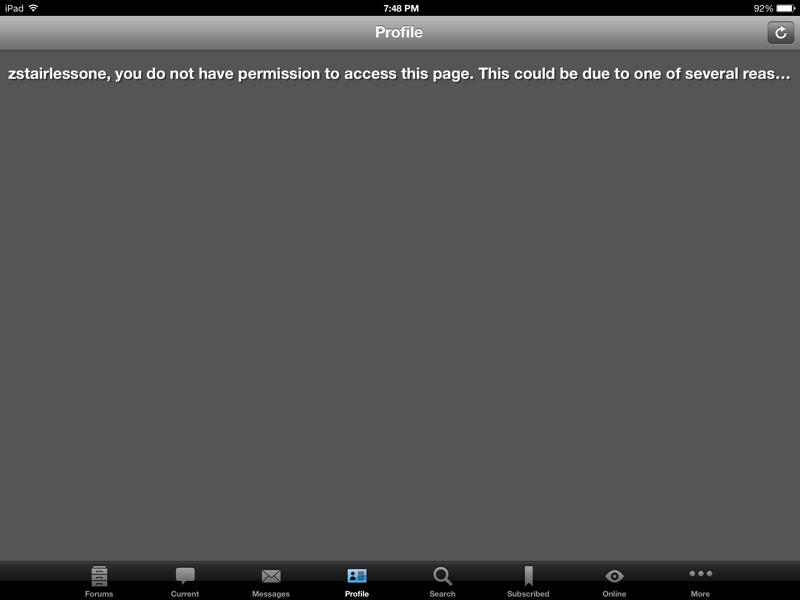 Cannot look at a member's profile - I can't even look at mine, I get an error saying I don't have permission to view this , could be several ...... It won't word wrap and I cannot see anything else. I am on an iPad with iOS9.3.1 Any ideas?