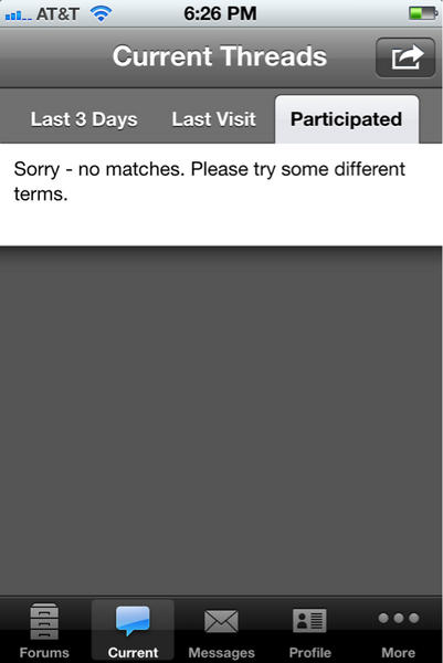 I think the point is that since other forums use the same app only with different branding that it should be working correctly. It's a configuration error or something else on the server/forum software side. It's not just the "participated" that's jacked, it's half the images show up as broken links, and some images that do show up have an error message displayed across them. The forum software probably just needs to be updated to the latest version if it's not already. If it is, then there might be configuration changes that could be made to the forum settings on the server that would allow it to work correctly with the iPhone app.