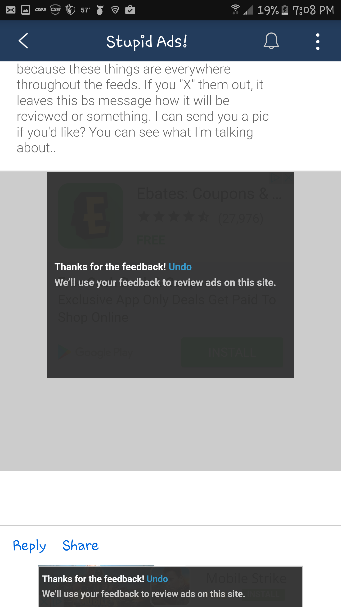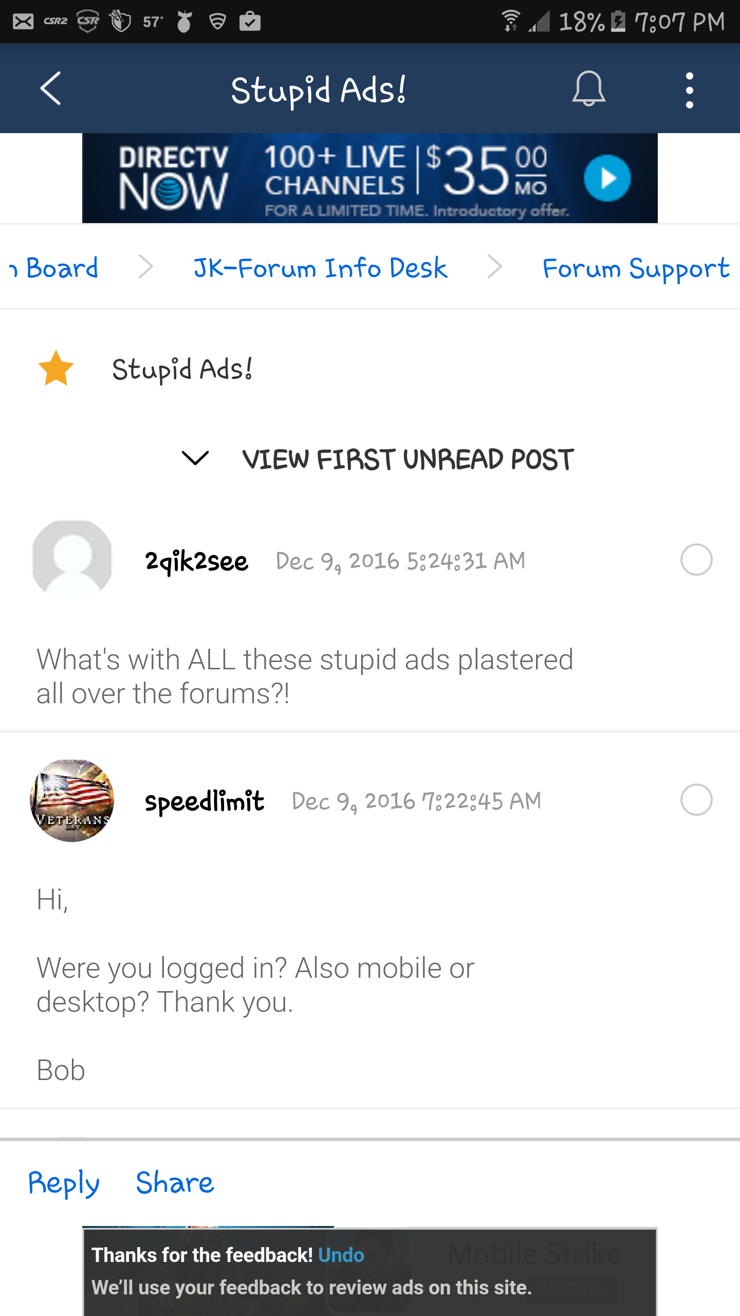 Mobile and I was logged in. These ads are terrible! Hard to read the forums now because these things are everywhere throughout the feeds. If you "X" them out, it leaves this bs message how it will be reviewed or something. I can send you a pic if you'd like? You can see what I'm talking about..