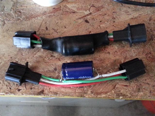 I just got 2 4700uf capacitors from radio shack, 1 for each light. If you want the high beams done you'll need 2 extra. Just stripped back the coating on the low beam wire and soldered it on then covered the whole thing with a piece of heat wrap. Been running these with zero problems for well over a month now.