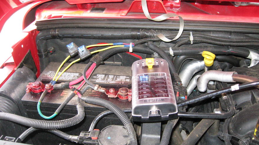 I have the same 12 circuit fuse block mounted to the top of the engine fuse block cover with 2 screws - better to keep it secure so it does not move around while wheeling. My + cable comes off the fuse block to a 100AMP resettable fuse located to the left (passenger side) of the battery. The block capacity is 125 AMPs so you could go a lot bigger on the circuit breaker than the 30 amp you have (you say relay but you must mean breaker right?). I got the breaker at AZ for pretty cheap. If you keep the inputs to the screw terminals long enough there is room to keep the block mounted on top of the engine fuse block and still be able to swing open the engine block cover. And yes there is room to close the hood without damaging the accessory block. Jeep is in the shop so unable to snap pics right now.