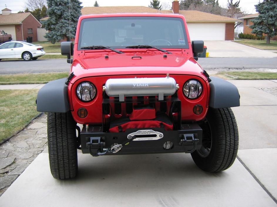 I installed my on board air. I didn't want to lose any space in the cargo area, & the tank was to big to mount under the jeep. So I fabricated a bracket to mount the tank over my winch on the front bumper. I mounted the compresser under the hood with the ONE OFF FABRICATION bracket