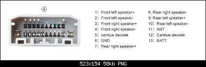 Also from what I've been told the stock alpine amp is a 5 channel amp with the 5th channel being for the sub. Based on the harness pictured it looks like there's no high level signal for the sub woofer. Does anyone have a picture of the factory plug (wont have access to my jeep for a few more days) or better yet know where the pins for the sub are in the harness? Next to #4 in the pic? Also, the clone head unit has low level RCA sub outs is it possible to convert the low level RCA to speaker wire and add connections to the A-s/eonon harness?