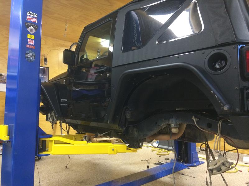 The fun began today. This morning, nice and clean. Dang those 40s make my 37s look small. And this afternoon, all pulled apart (still need to remove the gas tank, bumpers, and exhaust, but I am rolling solo in the garage and got a bit tired).