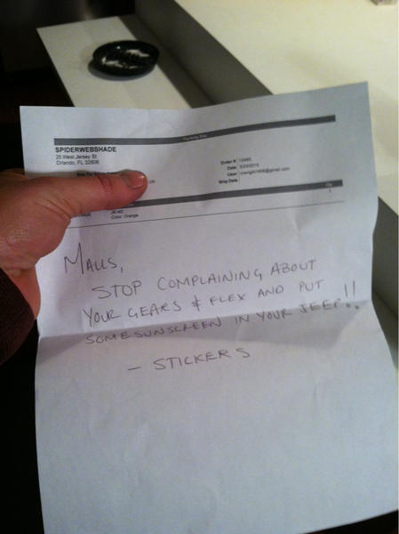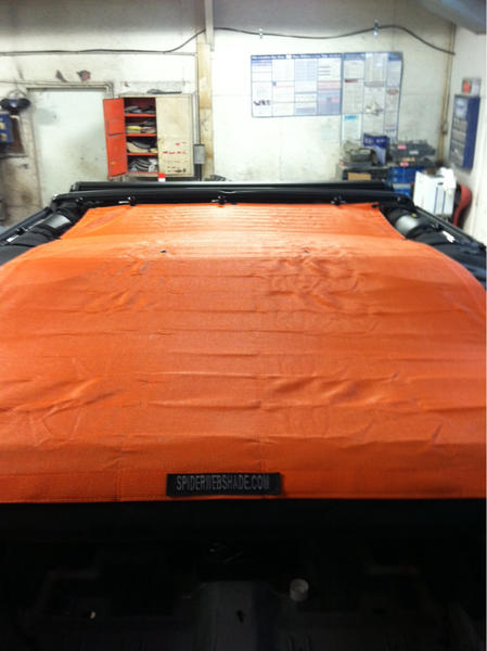 So I know this thread doesn't get that many views but for this one post I wish every member would read it... In November I bought my JKU used of a lot it was built buy rocky ridge custom trucks had a lift wheels tires and a winch. Thought it was the ultimate off road machine and was ready to run any trail out there. I was wrong. The definition of a total newb. So as I became more active on the forum and realizing what I had was the definition of a mall crawler, but also kept seeing this guy jk505 posting, almost everything he posted I agreed with. Then one day I was reading a wheeling report and some guy was fussing over winching a stock TJ the whole day. Jk505 or Cody aka stickers stuck up for the guy in the TJ he said friendship is 99% of why he wheeled and I thought man this guy really gets it! So I sent him a couple of pm's asking him typical newb questions. He could have blown me off I didn't know crap. But he didn't and he slowly coached me through building this rig and it's far from done but it's not a mall crawler anymore. Throughout the build we developed one hell of a friendship. The kind you don't find often in life. I now count him as one of my closest friends. One of the first thing we discussed was a spider web shade. It's been a running joke because I've spent thousands of dollars but never did get my spider shade. I got home from work today and I found this setting on my bar. I was speechless. This my friends is what the jeep community is all about. So the next time a newb joins and starts asking stupid posts, be careful how you dismiss them, you could be missing out. Thank you JK505 Sent from my iPhone using JK-Forum
