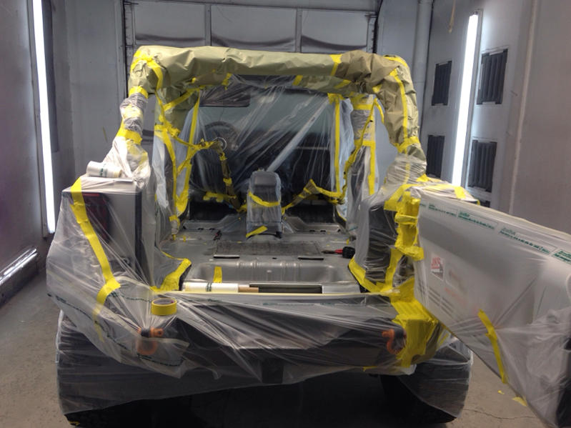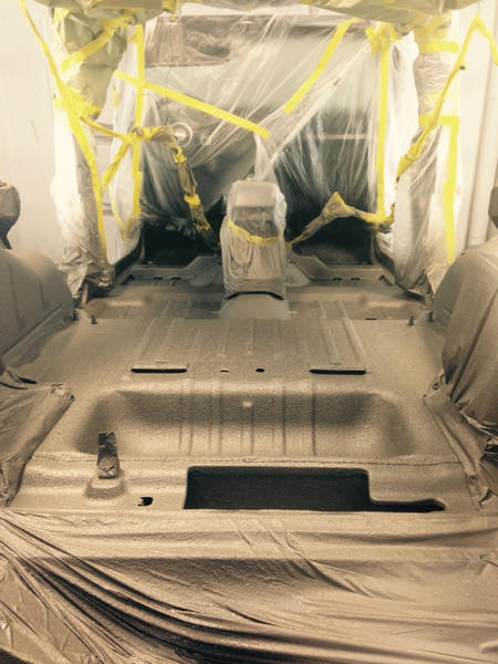 We got the paint booth open at 5 and started the process of prepping the interior for liner. Tapping and masking was a labor intensive process but needed to get a quality result. I had a lot of trouble trying to pic the color I wanted and everybody there decided that charcoal would look very nice so I tented it up, added 2 oz of silica to each mix and let it spray!!! It was nerve racking but the end result is super nice!!!!