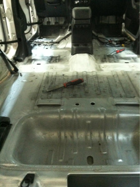 I don't even know where to start.... First off I busted the whole jeep apart Monday and started to strip for the raptor liner install. Tuesday I started the process of ripping up the sound deadening :eek: I thought that I could use a tool for removing seam sealer from cars called a snap on crud thug, this thing is awesome. The sound deadening laughed in it's face! So I busted out the air chisel and it did wonders!! Then I straight line sanded all the area I wanted lined with 120 grit sand paper, cleaned the surface and had to work Wed. And Thursday.