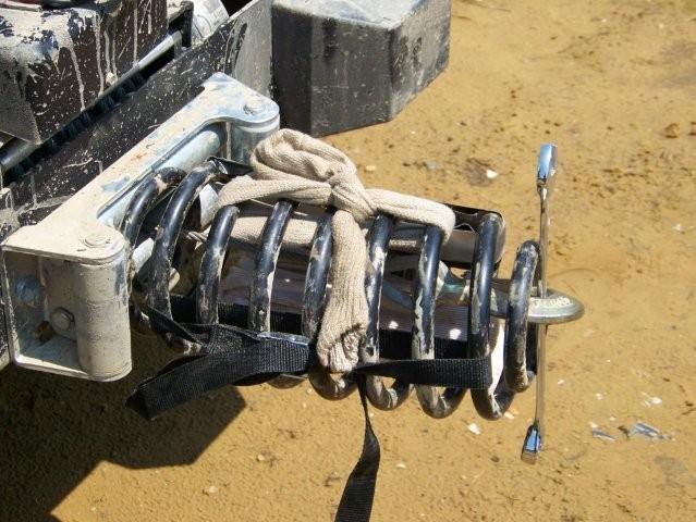 We used my warn winch and a craftsman wrench to compress the spring, then held it tight with what we had... gorilla tape, one tie strap, a sock, and a t-shirt. Scary but effective :o)