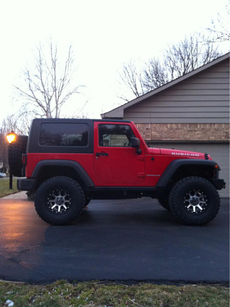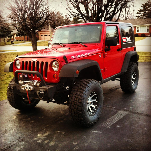 Mine is a 2013 JK Sport with 2.5" Teraflex budget boost (with shock extentions) and 35x12.5x15 BFGoodrich KM2's on 15x8 MB TKO wheels.