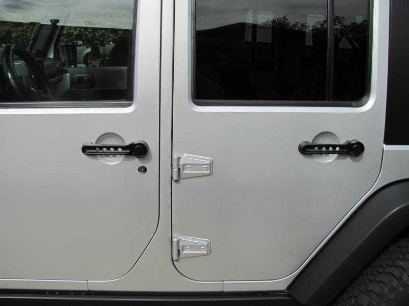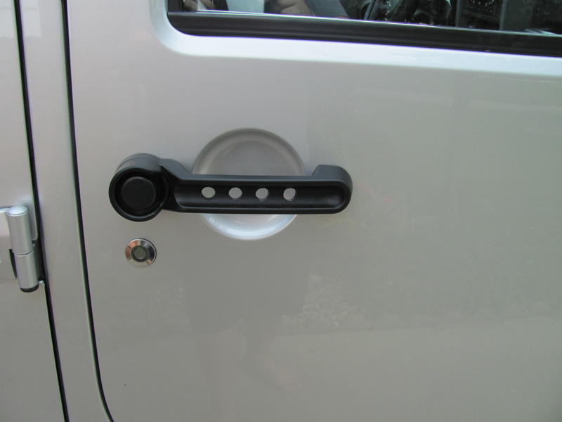 after trying my eye on the rear tailgate handle it was not to my perfection ( middle pic ). I then laid out a piece of masking tape and drew a line down the center and marked the center line at every inch. This was my template and i centered my strip between the round indentation in the door behind the handle. I then took my smallest drill bit and drilled through the center of each pencil mark. Peeled the tape off and moved it to the next handle and repeated the process. Then go back and use a 1/2" drill bit and go through each hole again......WARNING!!!! Make sure you use something behind the handle as when the drill bit reaches the end it pushes through with a good amount of force. I used a flattened pop can wrapped in cardboard and that did the trick. Free and easy mod and a great visual impact on my silver Rubi!