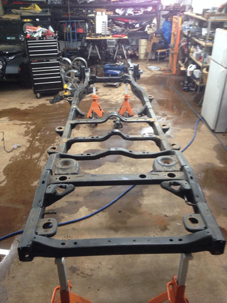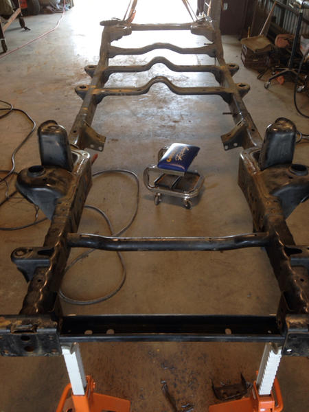 All of the old brackets have been removed(including the engine mount brackets) and i cleaned up the front long arm mounts and he is welding them on now, when he is done i will go back over and prep the rears and let him weld then gonna drag the LS motor and trans over and mock them up to ensure the mounts are located correctly then weld them on as well. Very exciting. Things are moving along slowly but steadily!