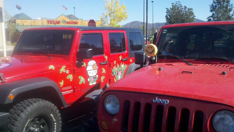 This was parked at the mall today. My Jeep is on the right. Not only was it decked out on all sides with hello Kitty sh*t, hello kitty tire cover, it also has hello kitty seat covers, steering wheel cover, and a sh*t ton of stuffed hello kitty animals everywhere, i was surprised they could shift with all the hk stuff around the stick.