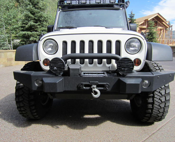 I had Screamin' Lizard regear it to 4.88s with an Auburn e-locker up front and an Eaton e-locker in the rear. Most of the rest of the work I've done myself, with the help of a number of friends from the forum ... I have Shrockworks rock rails, front and rear bumper. The rear bumper includes their tire swinggate, jerry can racks and trail rack. The hardtop has an MRBP rack with the optional basket, and light brackets. Because the light brackets only take three lights, I've fabbed up my own light bar across them to install four KC long rang Slimlights on the overhead rack. They are not currently hooked up because I'm awaiting a Benchmark Designs dual-battery kit (which I just received an e-mail from with a tracking number after seven months!!). I also have KC driving Slimlights on the light tabs on the front bumper. The front bumper also includes a Warn PowerPlant winch. The stock headlights have been replaced by the IPF JK replacement headlights from Northridge4X4, but I didn't like the bulbs so replaced with with the cheapest ($20) Sylvania Halogen bulbs I could find. They are awesome compared to stock.
