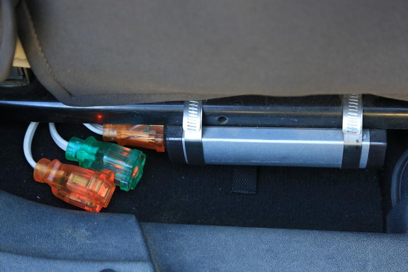 I'll start with the inverter: An old, 350-watt Radio Shack inverter I've had for years. I strapped it beneath the passenger seat (which area on the '07s has some OEM air bag weight sensors that they either left off or made smaller in later years). I hard-wired it directly to the auxiliary battery (dual batteries in my Jeep) using #12 gauge wire. The inverter has two power ports, but where it's mounted would have been awkward to use. So, I found a six-inch, dual outlet extension cord with neon lit plugs. I keep that plugged in, and everything gets plugged into it. "Everything" includes chargers for camera gear, laptop, projector (for showing movies while on the trail), etc. Basically anything that requires 115 VAC and that I don't have a 12 volt adapter for.