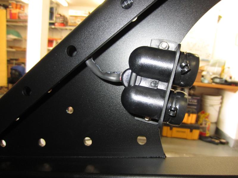 On the back side of the swing arm I have installed a weather proof dual 12V outlet to power the removable flood light and any other accessory: