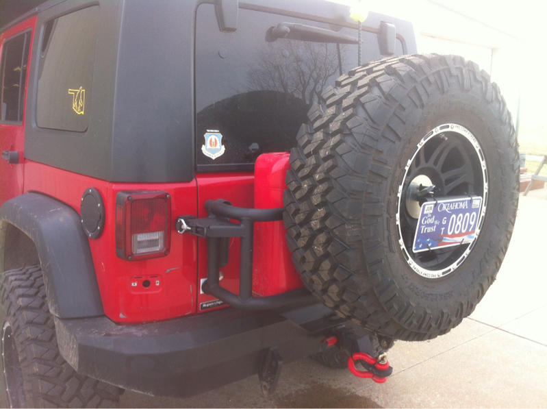 You need to look up OR Fab's swing away tire carrier, it'll hold up to a 37" tire, CB antenna, Hi Lift jack, and the option of two Jerry Cans, two Roto Pax, or neither. I have the jerry can option and it works great and is very sturdy. It doesn't make any noise and I've even used it as a ladder to get on top of the jeep. You can keep the bumper you have since it operates like the Teraflex hinge and it's much cheaper than bumper/tire carrier combos. Mine was just about $580.