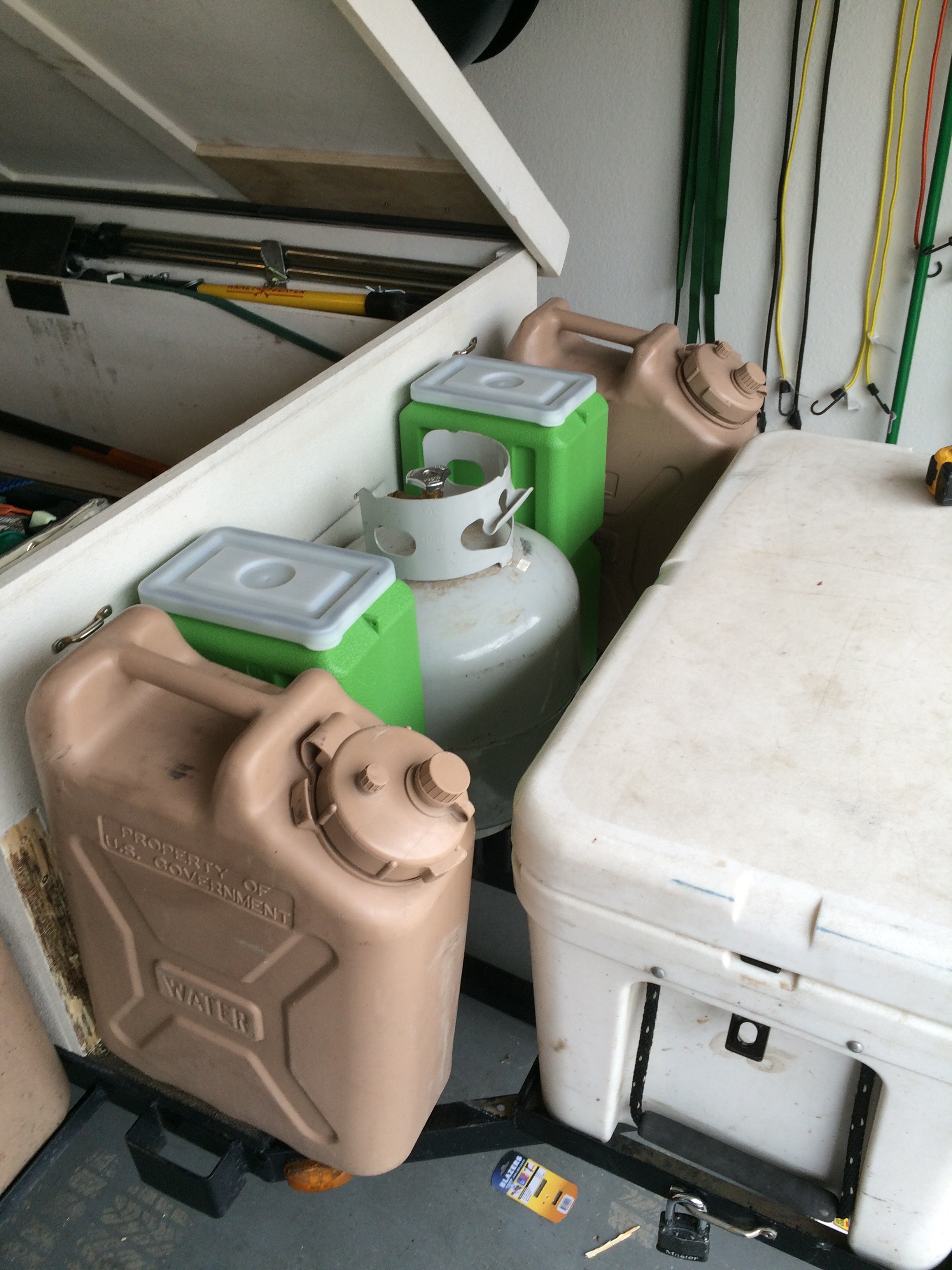 I like what Mark has done in the back of his Jeep and plan to do something similar, but smaller draw so that the dog has a room back there. For the times I go with a friend or 2, I have a trailer and just added a roof top carrier to carry sleeping bags, and what else to keep the back of the Jeep clear. then cleaned up the front for water/gas tanks and propane.