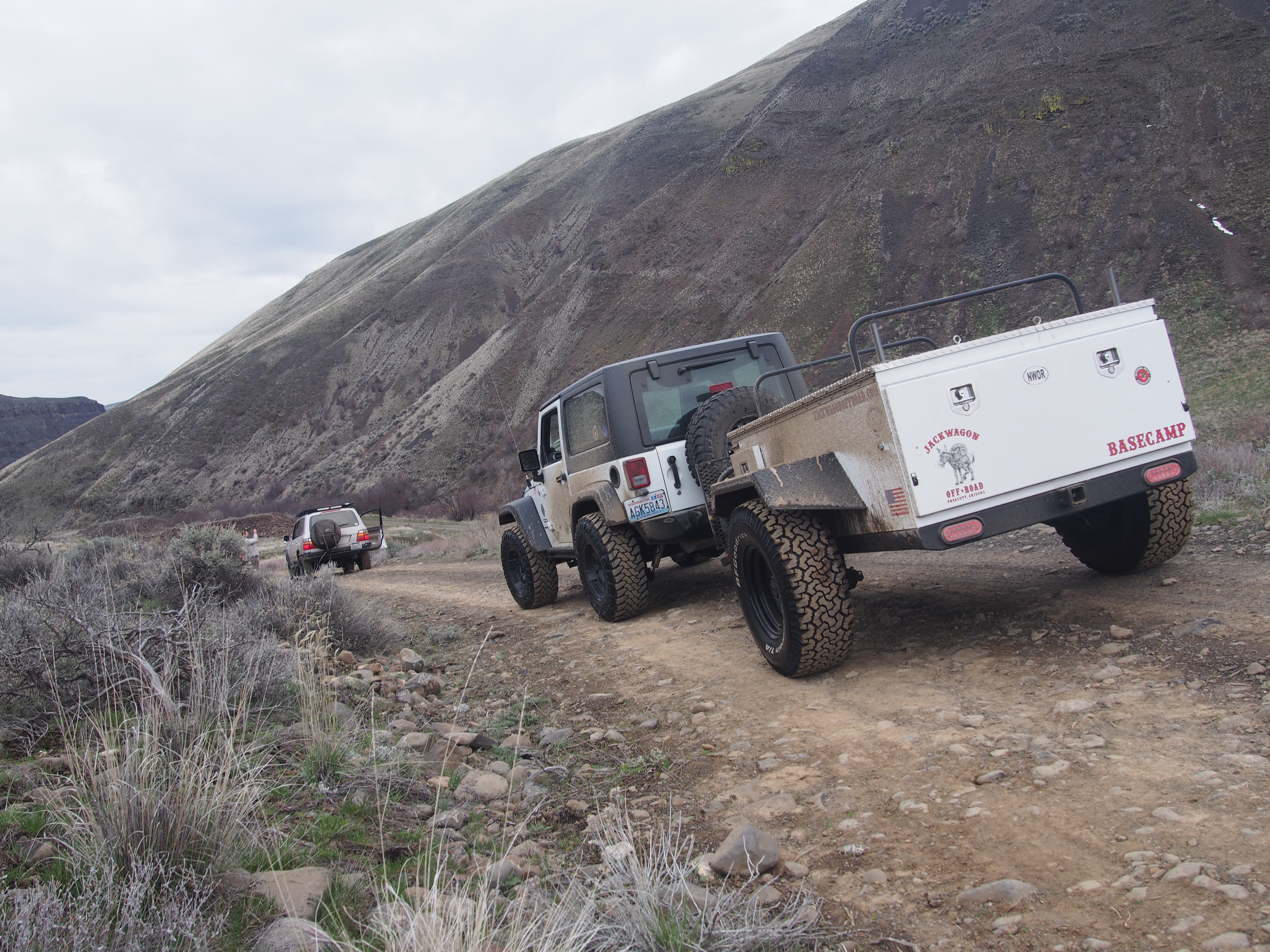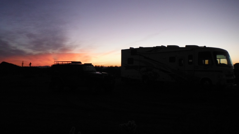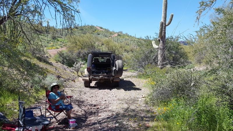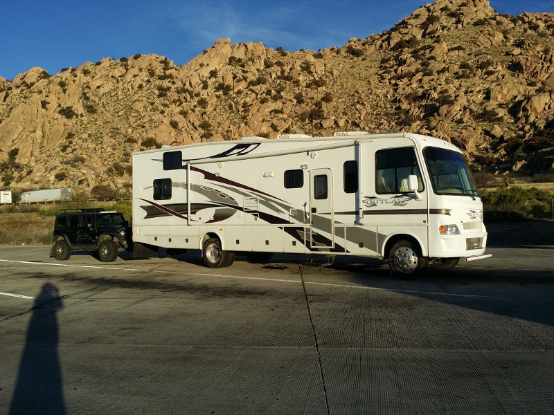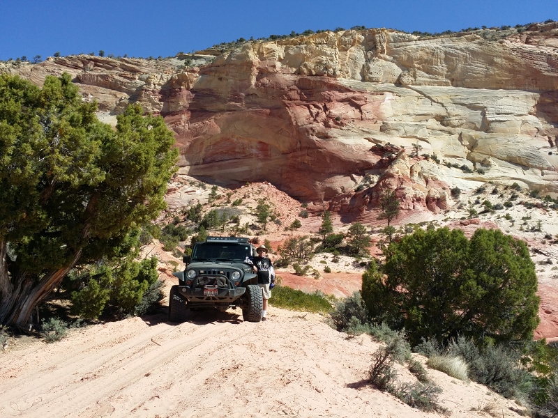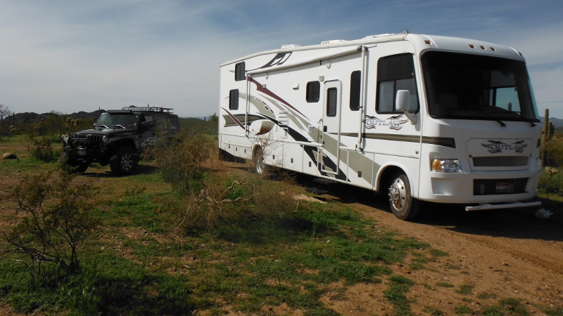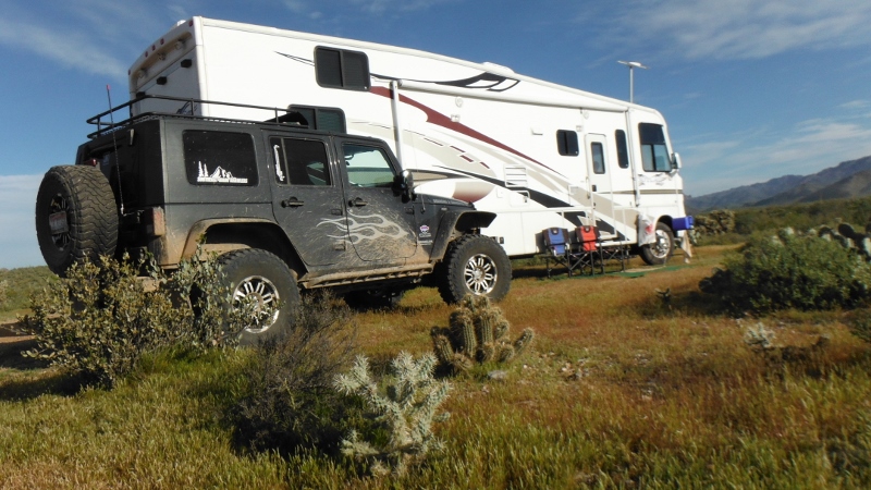 My wife and I just returned from spending a month in Southern Utah and Arizona. I think next year we will spend at least two months. Our Jeep is expedition modded, and I've gone Jeep camping in it with my brother and his Jeep. However, the wife isn't interested in roughing it, so you can see our camping rig in the attached photos. We also go camping and ATVing in the summer, and our motorhome is an Outlaw toy-hauler. We left the ATVs at home for this trip, but we can take the Jeep and the ATVs both, if we want, for short trips. We seldom stay in a campground so the Outlaw is equipped for boondocking. The photos are from the following areas. St. George UT, Apache Junction AZ, and Fredonia AZ where we wheeled in Northern AZ and near Kanab UT. I broke one taillight, peeled the boot off the rear driveshaft, and the clock spring went junk from the dust. Jeep has a recall on the clock spring, BTW, and they install a different steering column shroud that is supposed to eliminate the problem. I hope you enjoy the photos. The Jeep on its top isn't ours, BTW. We used the "Funtreks" guide book to help us find the trails and I would highly recommend using these guides and the GPS data cards that you can get to go with them.