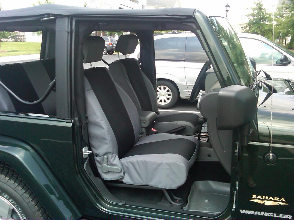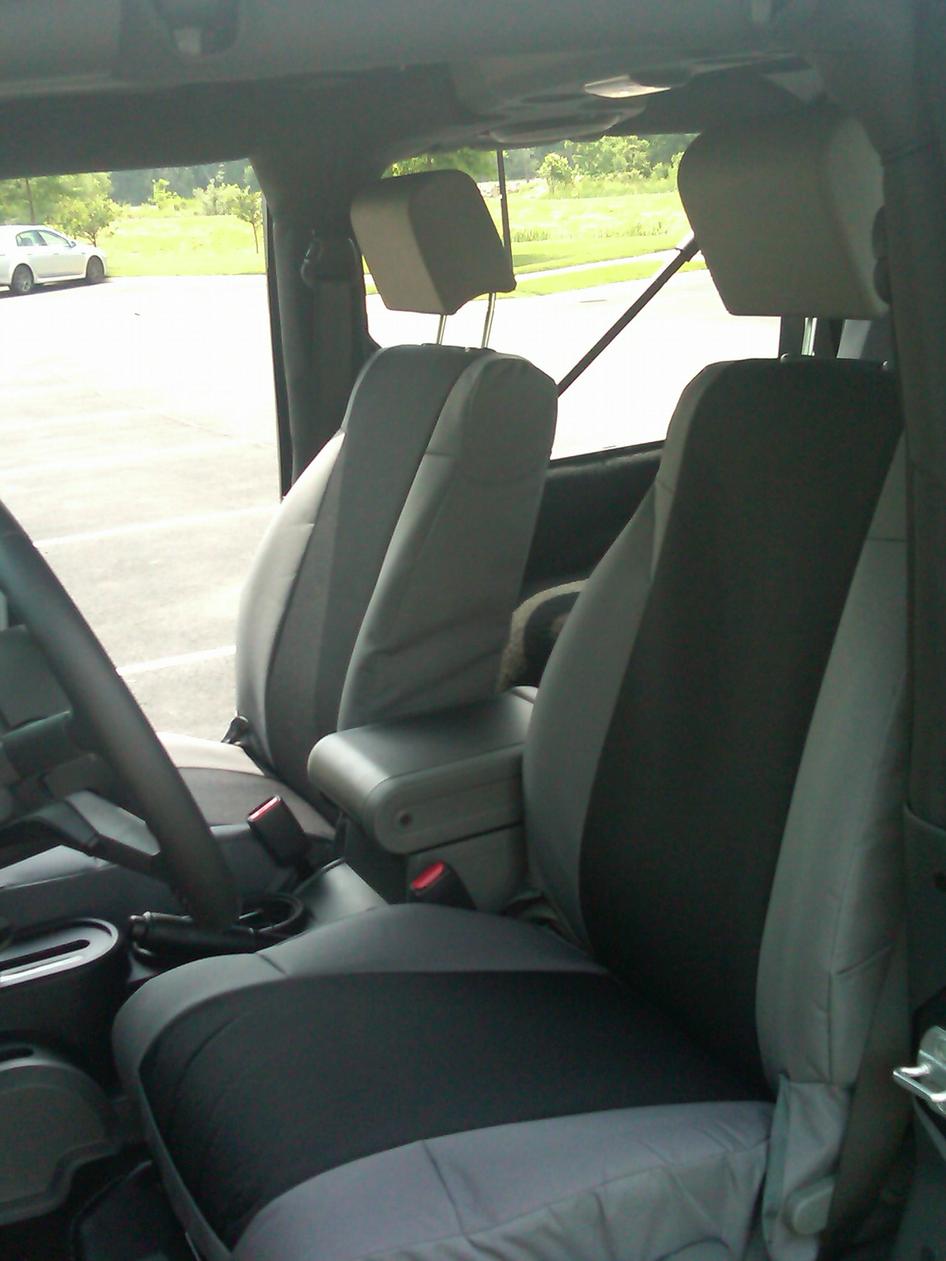 I spent a looooong time on the forums looking for info on seatcovers - mostly the discussions I found were on the pros/cons of neoprene. I had neoprene on my first jeep (TJ) and I knew I didn't want a set because the old ones had faded from black to purple, and in the summer really gave you an advanced case of swampass (not to be confused with mudbutt). There wasn't much talk about different custom fit seat covers for a 2010 JK, but every once in a while I would see a vague mention of marathon or gt seat covers. I finally pulled the trigger last Sunday and bought GT seat covers (I don't know if I can post a link, but you should be able to find them on google). I liked the site because they had many different materials and TONS of different colors/styles. I settled on the endura black/charcoal (c1/c8) because they most closely matched the look of my factory seats which I liked, and the description said they were waterproof, fade-resistant, stain-resistant, and didn't get really hot in the sun (unlike neoprene).