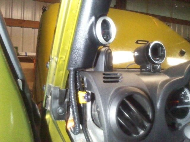 Further back view, the gauge on the right is from Aeroforce and it simply plugs into the OBD connector. I think it would have looked more factory with both in a 2-gauge pillar mount. However, pressing the buttons on the Aeroforce seemed easier for me where it is.
