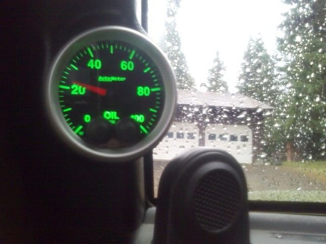 Close-up of the Autometer 5652 OP gauge in an A-Pillar 13118 mount. It has LOLO, LO, HI, and HIHI alarm setpoints. The colors are configurable, this one is set: green for normal, red for LO, yellow for HI. LOLO and HIHI blink the selected color. Optionally it can use the dash dimmer, but it's using the feature that sets it at low brightness for the normal band all the time – That makes it a 2-wire (key-on + and -) hookup, plus the wires to the sensor. Instructions for that are here