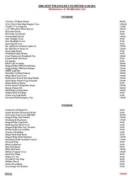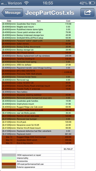 So this anal-retentive Jeeper decided to not only list his mods and accessories and their prices, but decided to color code them too! The Jeeper is me by the way.