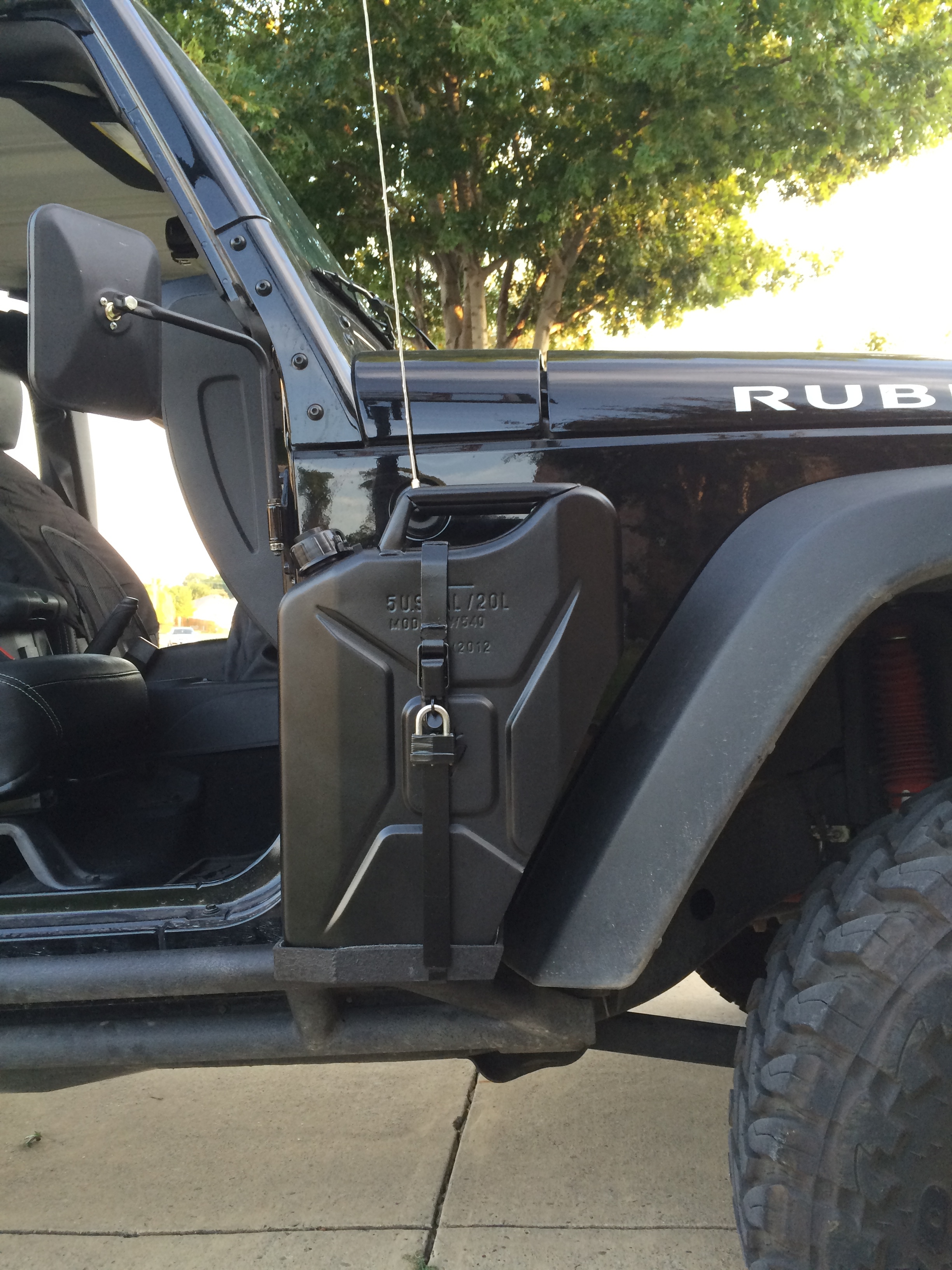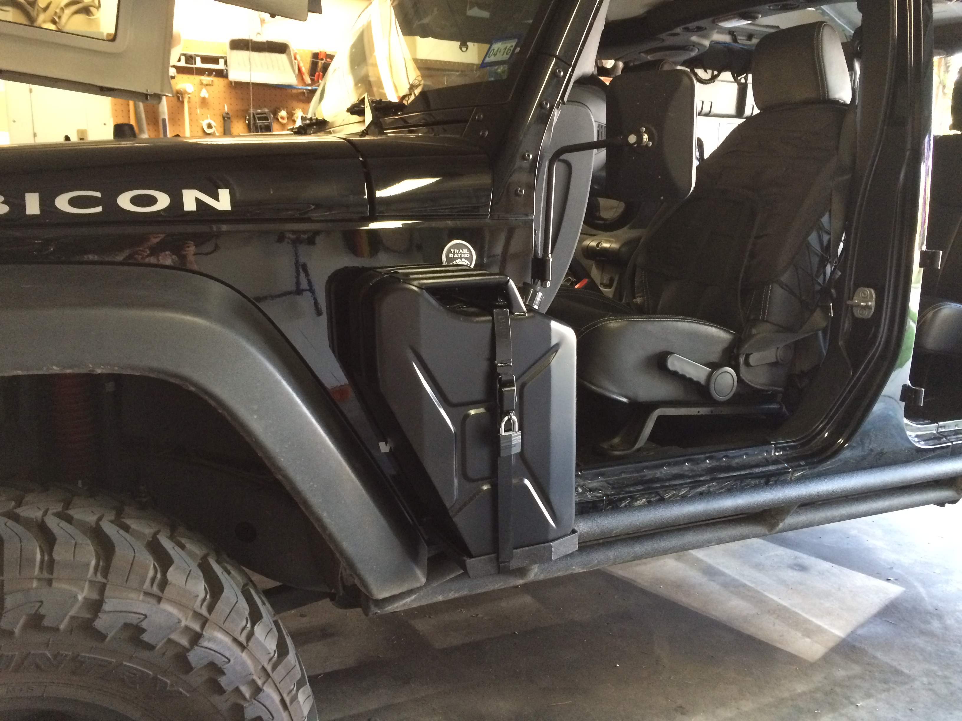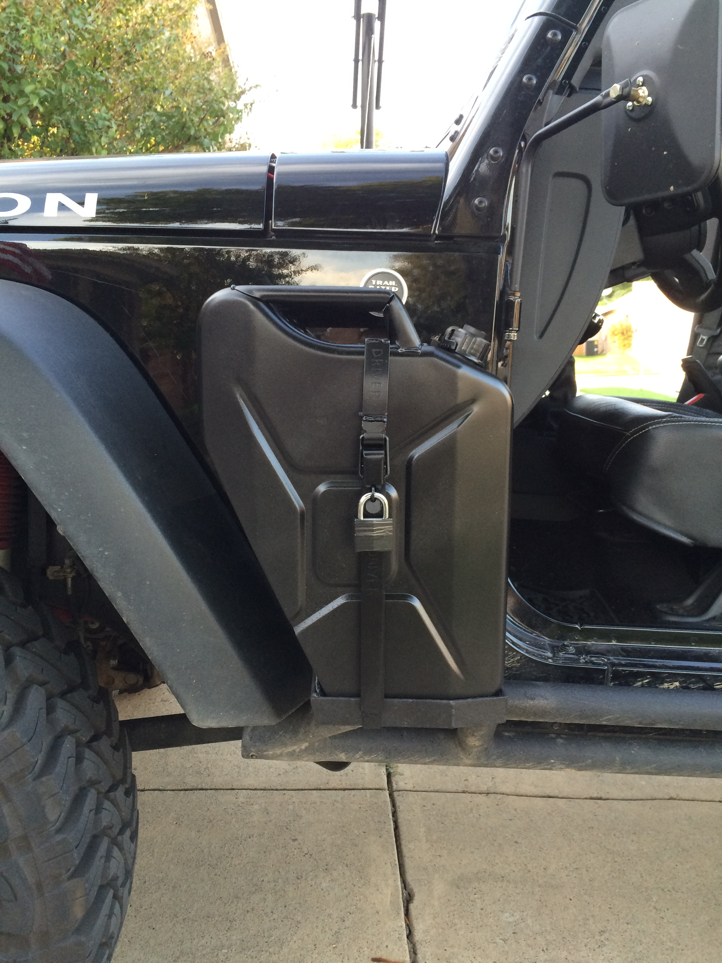The Jeep in question is sporting a pair of these side mount jerry can holders...