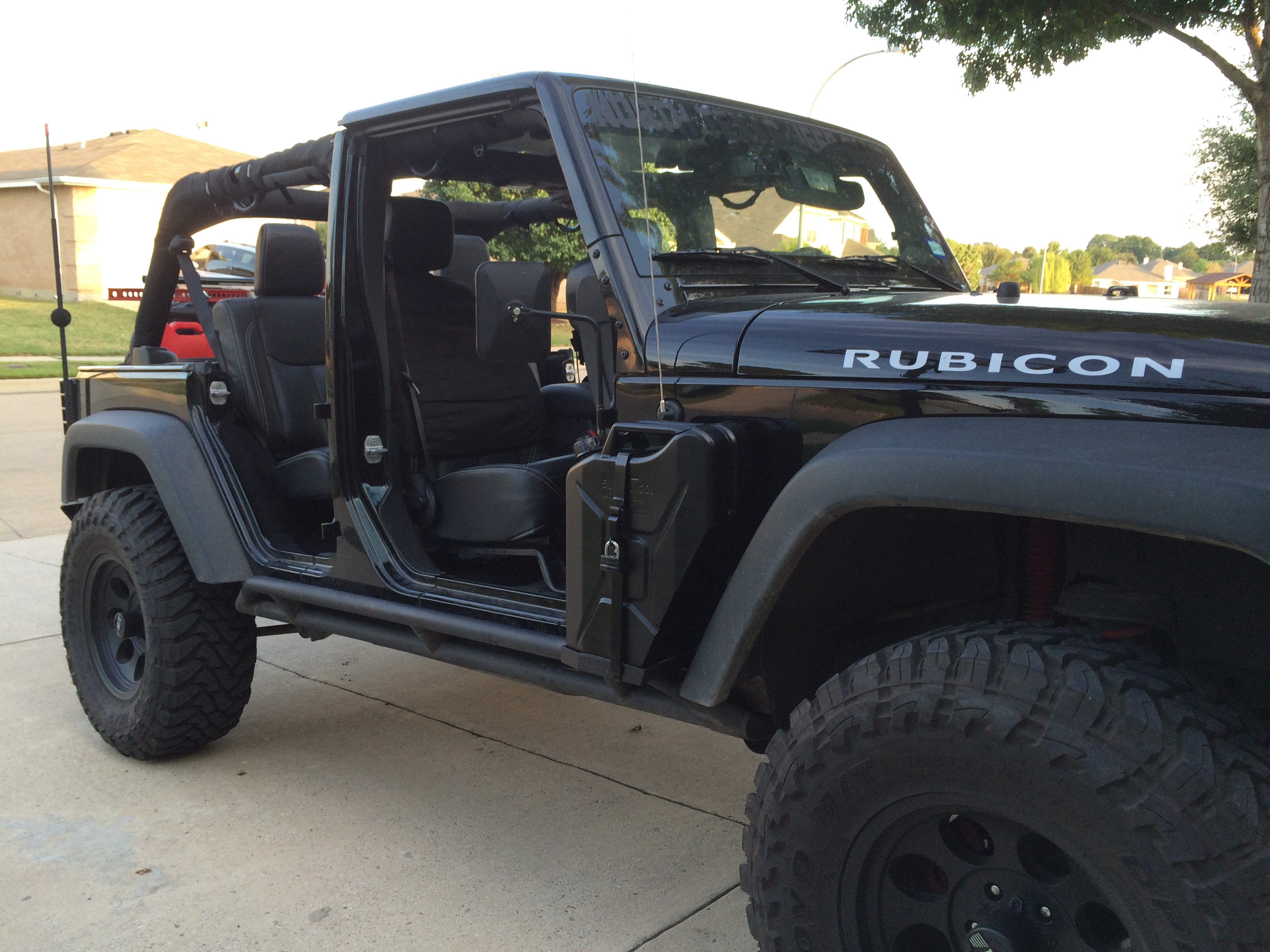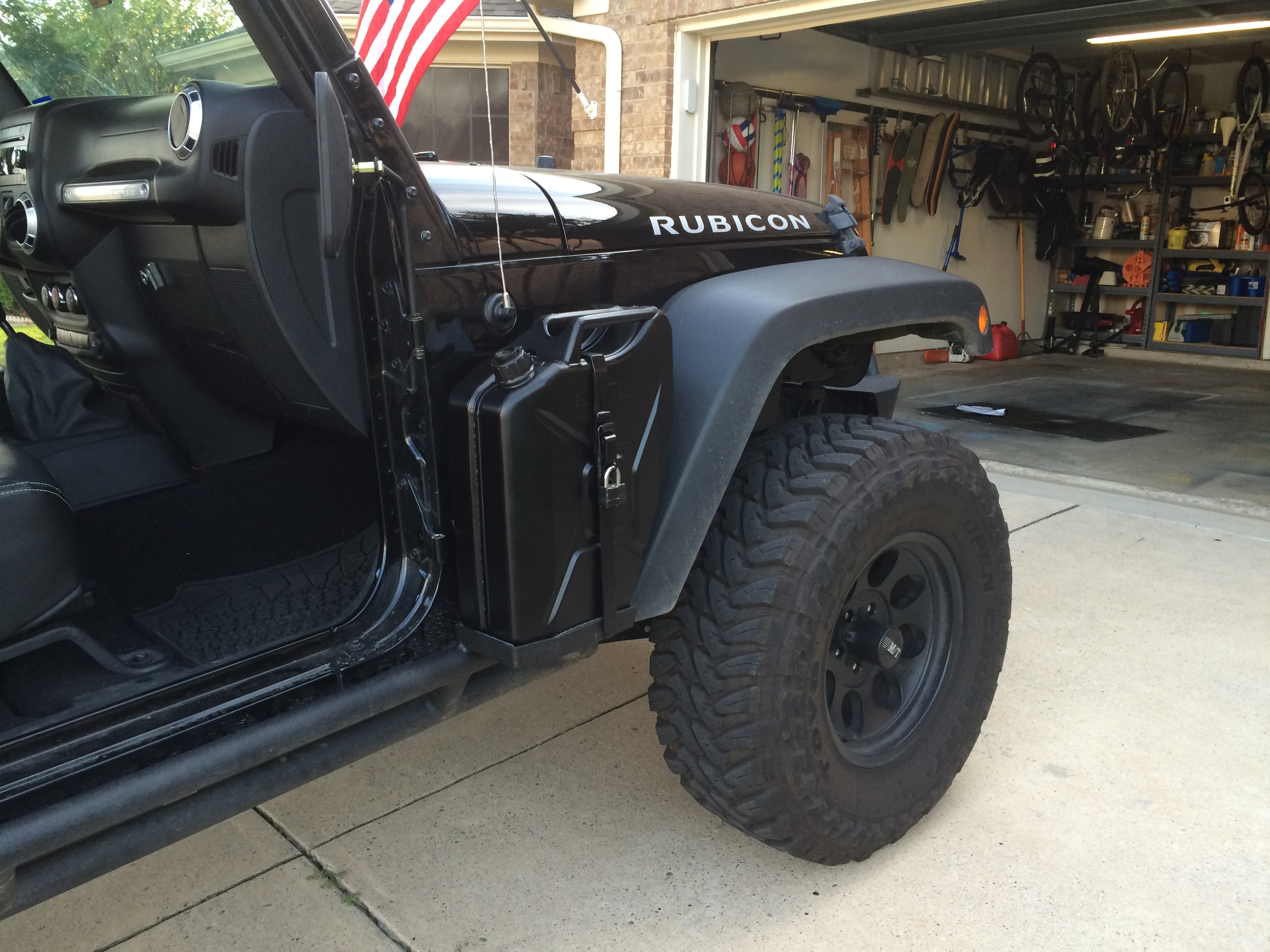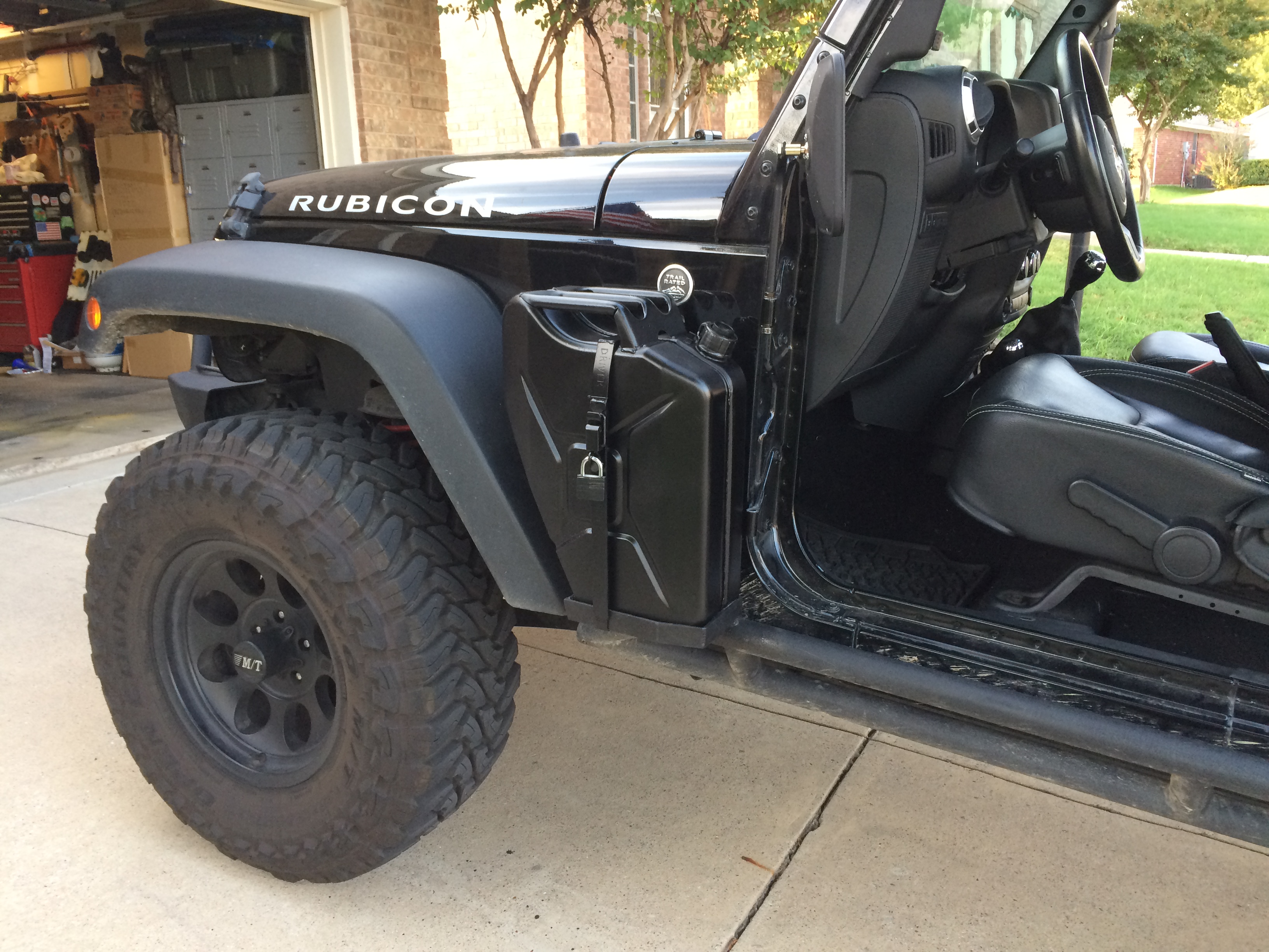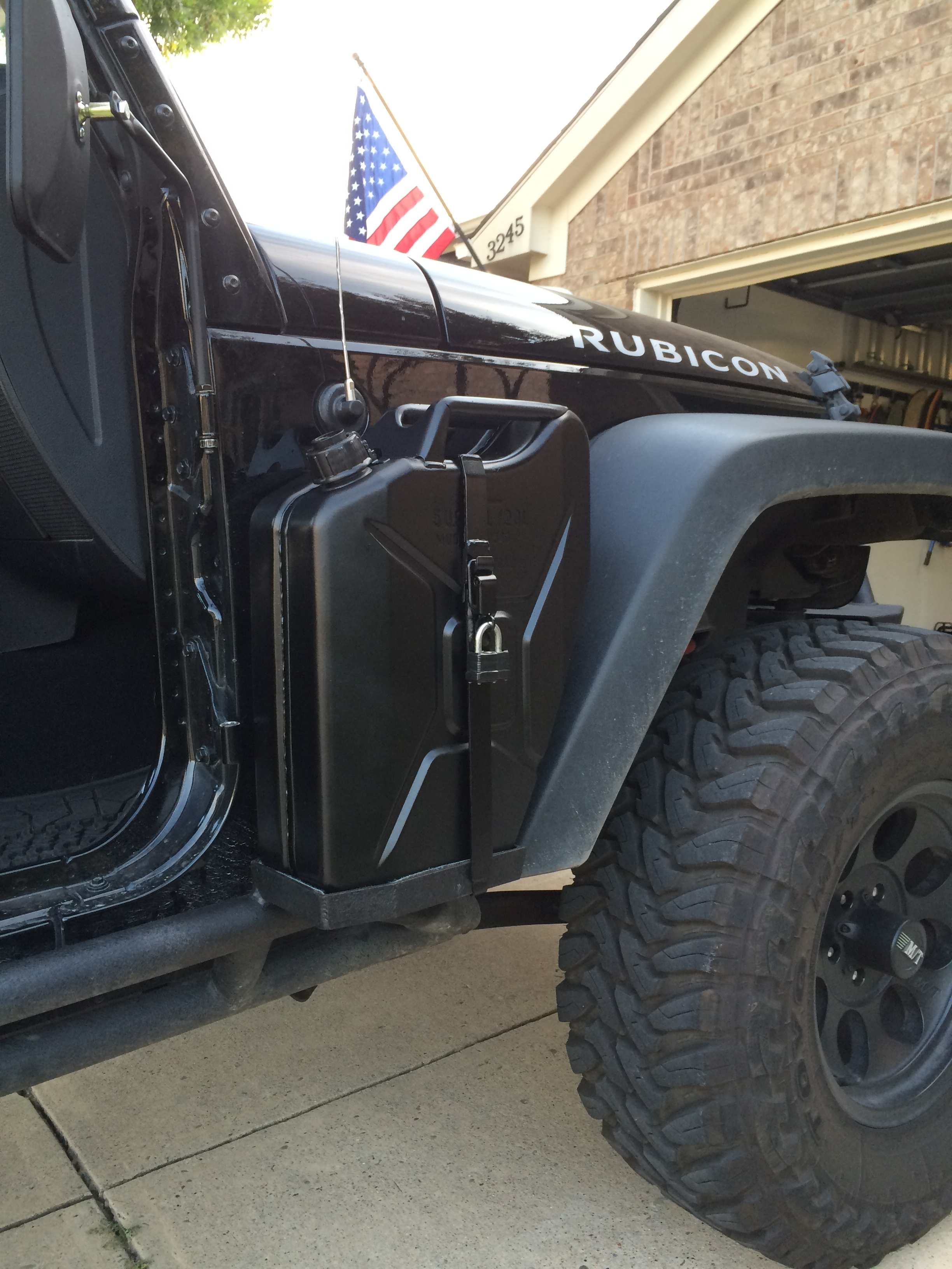The Jeep in question is sporting a pair of these side mount jerry can holders...