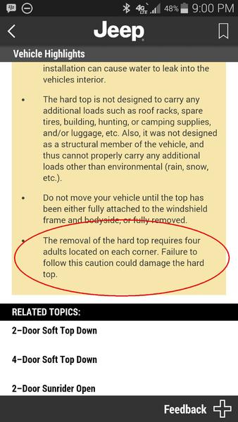 Never underestimate a desperate man who is alone and wants to take off his Jeep top on a nice day. All of the sudden the average man becomes either a world class strong man or an engineer who can design the golden gate bridge. We have all been there. LOL