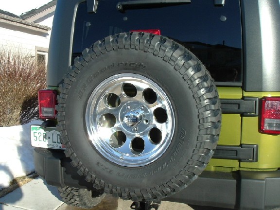 Pics of the New BFG M/T's and the Mickey Thompsons. Backspacing makes the fit in the spare no problem, just not much brake light visable. no worries.