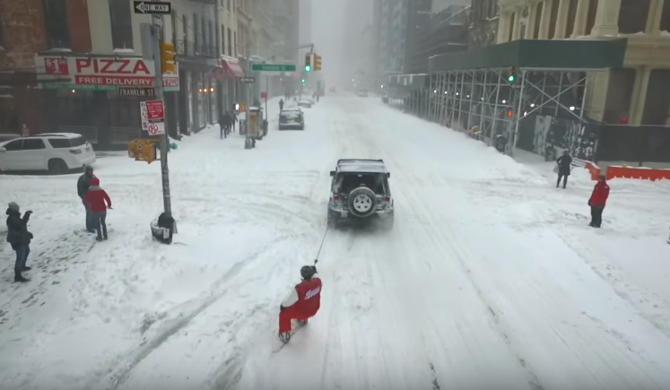 Snowboarding Behind a Jeep Wrangler Through NYC is Smile Fuel