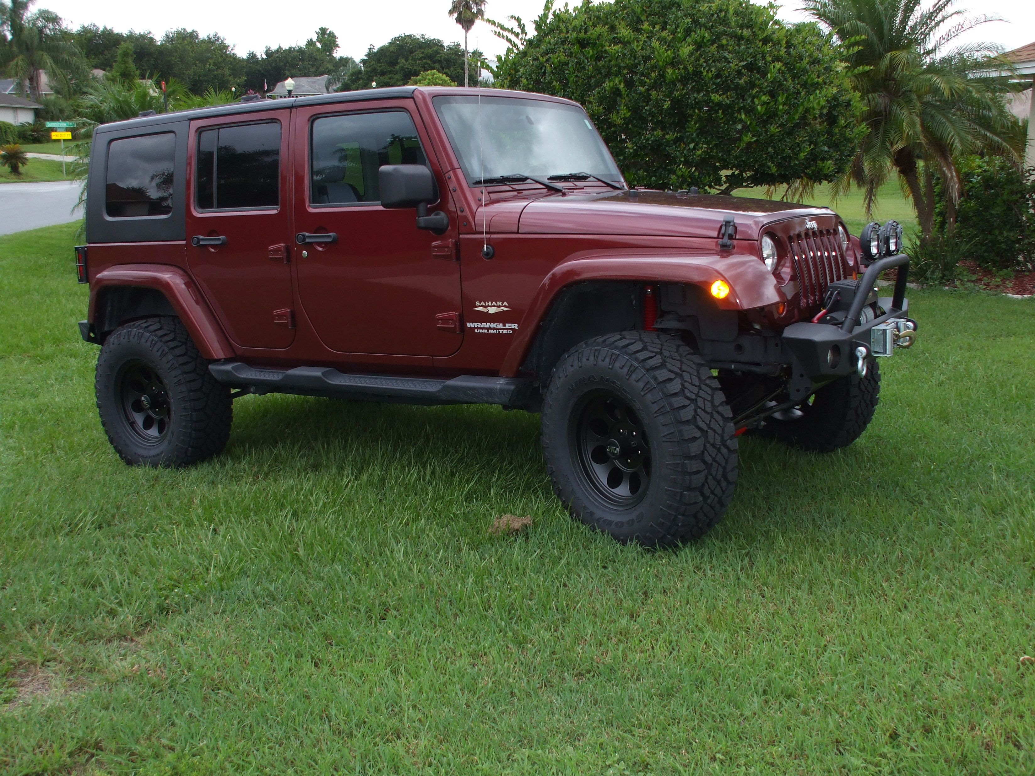 4" BDS Lift with Fox reservoir shocks, Fox steering stabilizer, 18" XD rims, 35" Nitto Mud Grapplers, heavy duty spare tire holder, stubby antenna, fuel door, Rocker Panel Guard (SRC Series), Tail Light guards' and some other minor stuff inside.