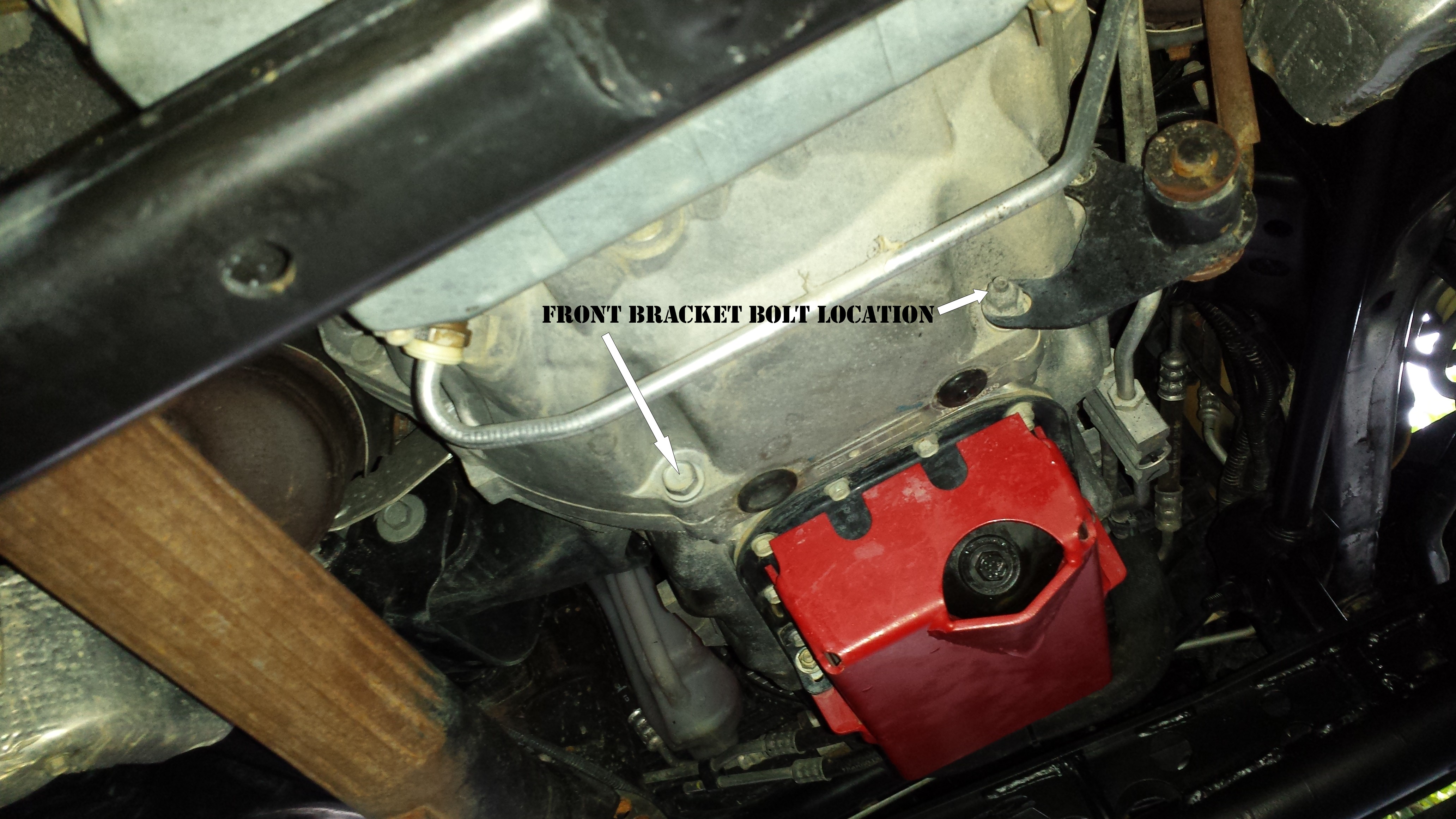 Install the rear skid plate mount to the 2 front trans mount bolts (do not tighten down). Next remove the front exhaust bracket and the 2 bottom bell housing bolts. Mount the front bracket and reinstall all hardware / bracket. Next was a little difficult for me but it could be just exhaust damage to my Jeep, slide the plate between the brackets and the exhaust pipe and mount the plate to brackets. Note on mine I had to use a C clamp to move the exhaust pipe down a few mm's to get the plate to slide all the way back. Mount and secure all bolts (don't forget the rear bracket/ trans mount bolts).