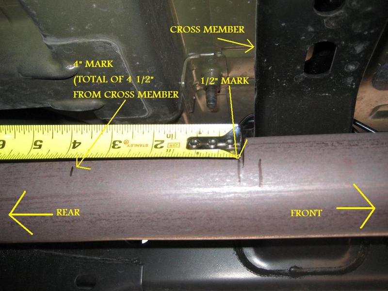 Mark the exhaust tubing for cutting. The kit came with a 14” muffler, soI needed to mark a line ½” toward the rear of the cross member shown in the picture below. Then add 4” to that measurement. (a total of 4 ½” back from the cross member). If your kit comes with an 18” muffler, only measure ½” back from the cross member.