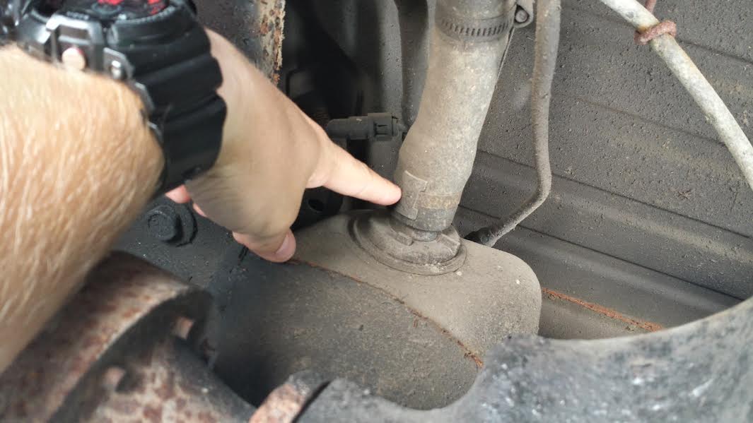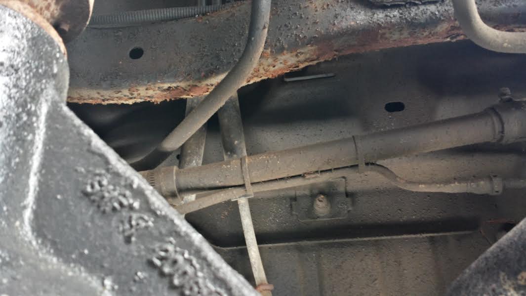 The part we are replacing sits directly above the rear axle and slightly forward. It runs parallel to the ground and is easiest to access by sliding under the Jeep from the rear bumper. In this picture, you can see the fuel tube, as well as the rear differential. (The fuel tube runs horizontally from the driver side tire to the passenger side tire.)