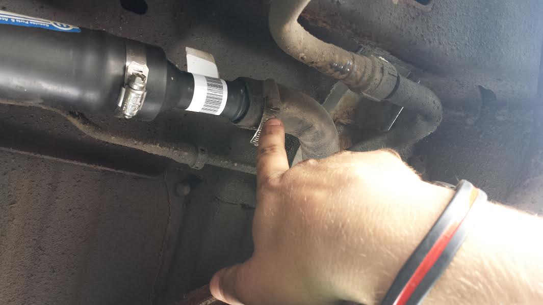 Now we need to loosen the hose clamp that connects the new part to the filler neck. There are 2 clamps that hold the part in. This is the hose clamp on the driver side that needs to be loosened.