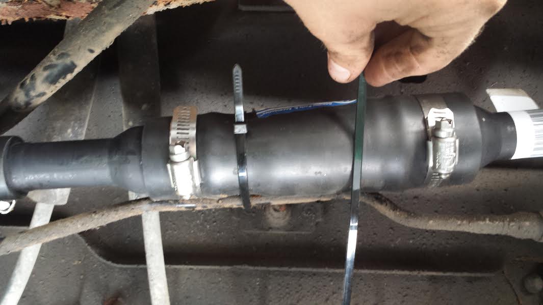 Now we need to loosen the hose clamp that connects the new part to the gas tank. This is the hose clamp that connects to the fuel tank and is on the passenger side (relative to the new part). Notice that it is located almost directly above the rear differential.
