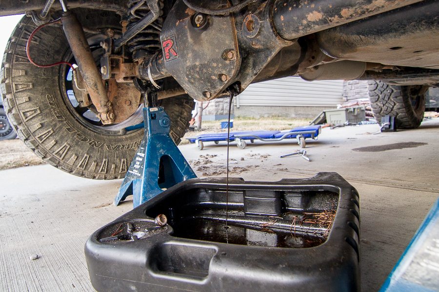 So for starters, get a drain pan and pull the lower and upper plugs on the rear differential.