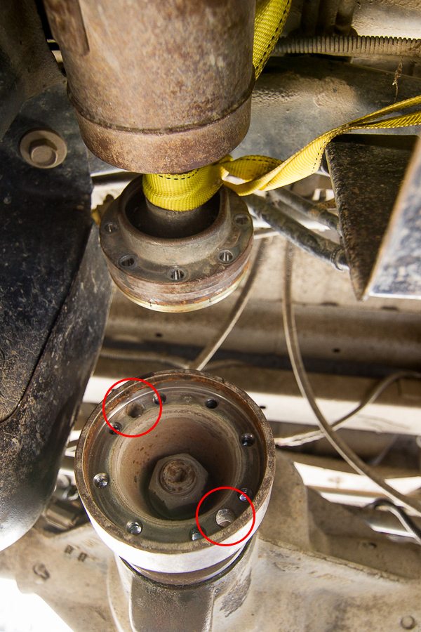 Once the driveshaft is free, you can secure it to the crossmember directly above to allow your self room to work. The two circles are the holes mentioned from the previous step.