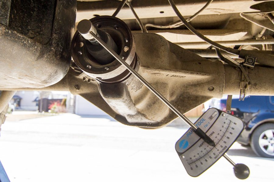 Measure the torque require to spin the pinion nut. The reading should what you recorder earlier, plus 5 inch pounds. If your reading is less, torque down the pinion nut in 5 foot pound increments until your reading is 5 inch pounds greater then your recorded reading at the start. Mine took 175 ft lbs before I got that reading.