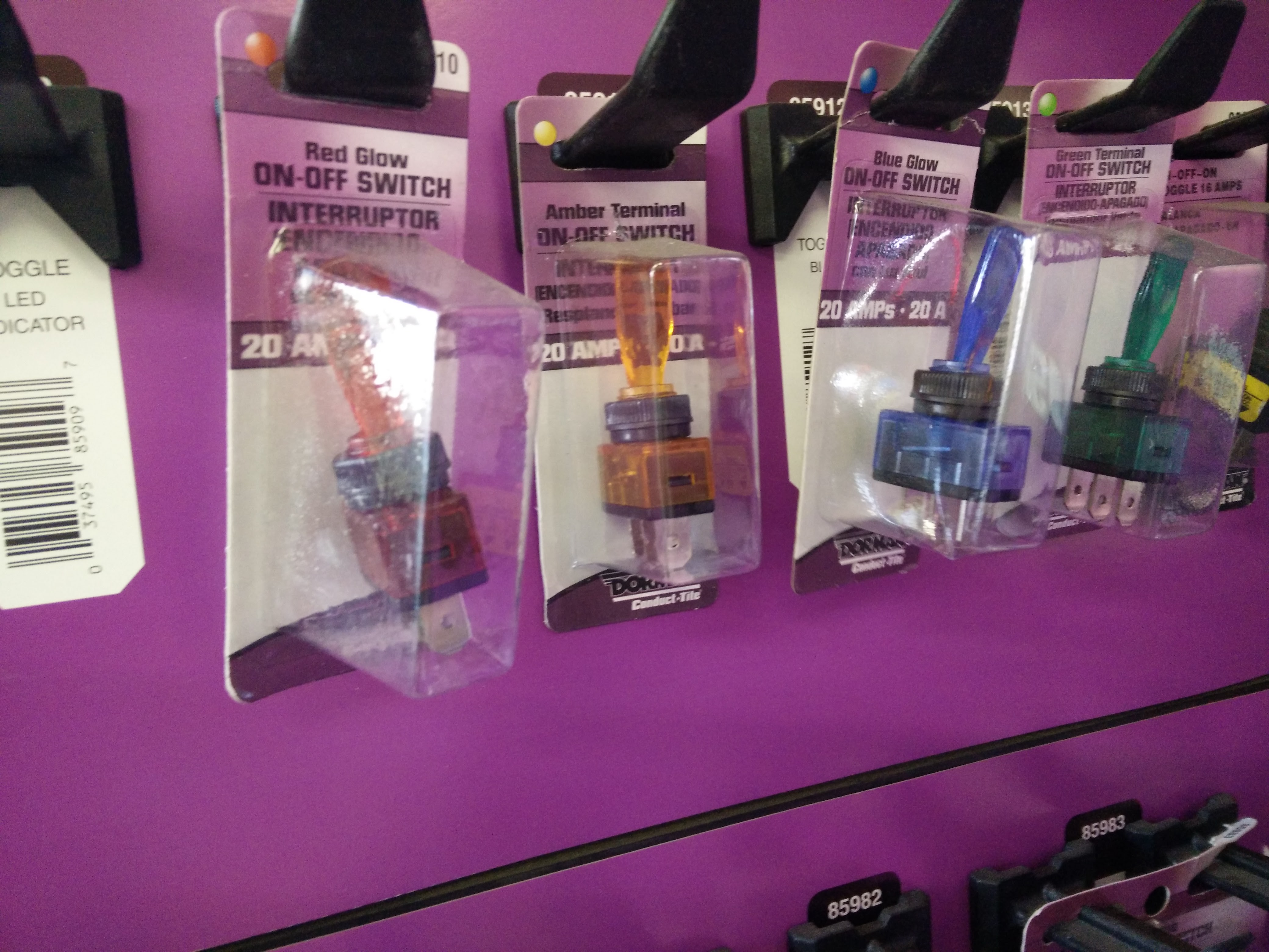 Note: I'm not a fan of the switches I used, but they were the only ones that I found that would fit in the switch panel. I picked them up at the local auto store. Also, the ring that they came with to screw the switch on so it stays in place was too thick so I used the thinner metal ring from another switch that I had from my last jeep. The metal ring also makes the switches not look so cheap. If you're really careful and precise it looks as though you can fit 4-5 switches on this panel. Might disturb the integrity of the plastic though. I've also thought about cutting out the off-road part and putting in a piece of metal/plastic cut to the right size. The way the off-road panel bows out really limited my choice of switches.