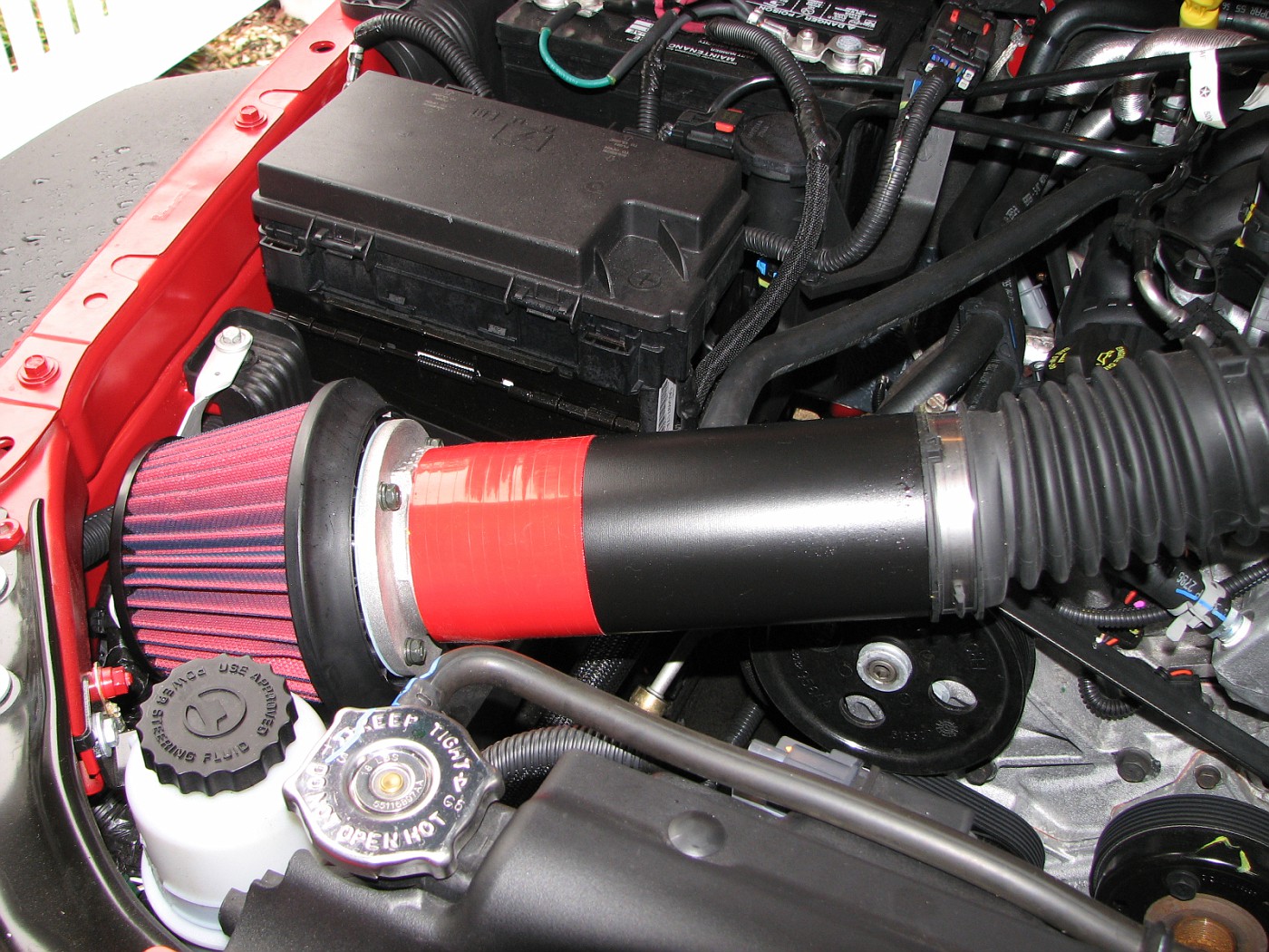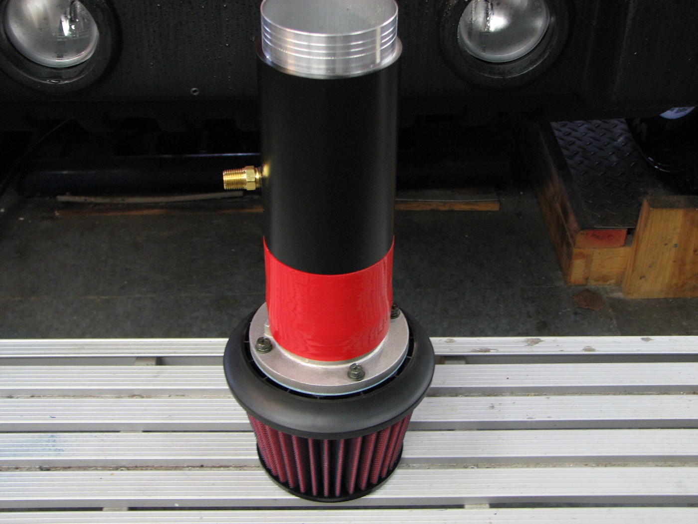 I had this Apexi Dry filter lying around with nothing to put it on until the Jeep arrived... Took an aluminum pipe, turned the ends to mate with the stock intake tube and a silicone adapter for the Filter, Put a breather bung in it and powdercoated the whole thing black. A simple bracket and it was ready to rock! Need to build a heat shield yet, but overall it feels and sounds great! Mileage is up in a short test, and breathing is very obviously enhanced...Total outlay, about $85....