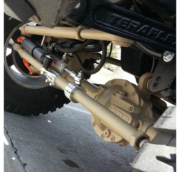 The complete front-end setup on my rig: Reid Knuckles, Dynatrac Ball Joints, RCV axles, Currie CurrectLync steering kit, TeraFlex Monster Track Bar, TeraFlex Dual-Rate sway bar, PSC Trail Assist steering (2008 version), TeraFlex stabilizer, TeraFlex Big Brake Kit, TeraFlex 6" lift spring for JKU, JKS ACOS Pro, Full Traction Long Arm Kit, Elka shocks, ARB locker, 4.88 gears, JE Reel 1350 drive shaft, AEV Pintlers, SpiderTraxx 1.5" spacers, Goodyear MTR 37s. Before steering stabilizer--even with this entire list of mods... twitchy. After, now feels very close to stock.