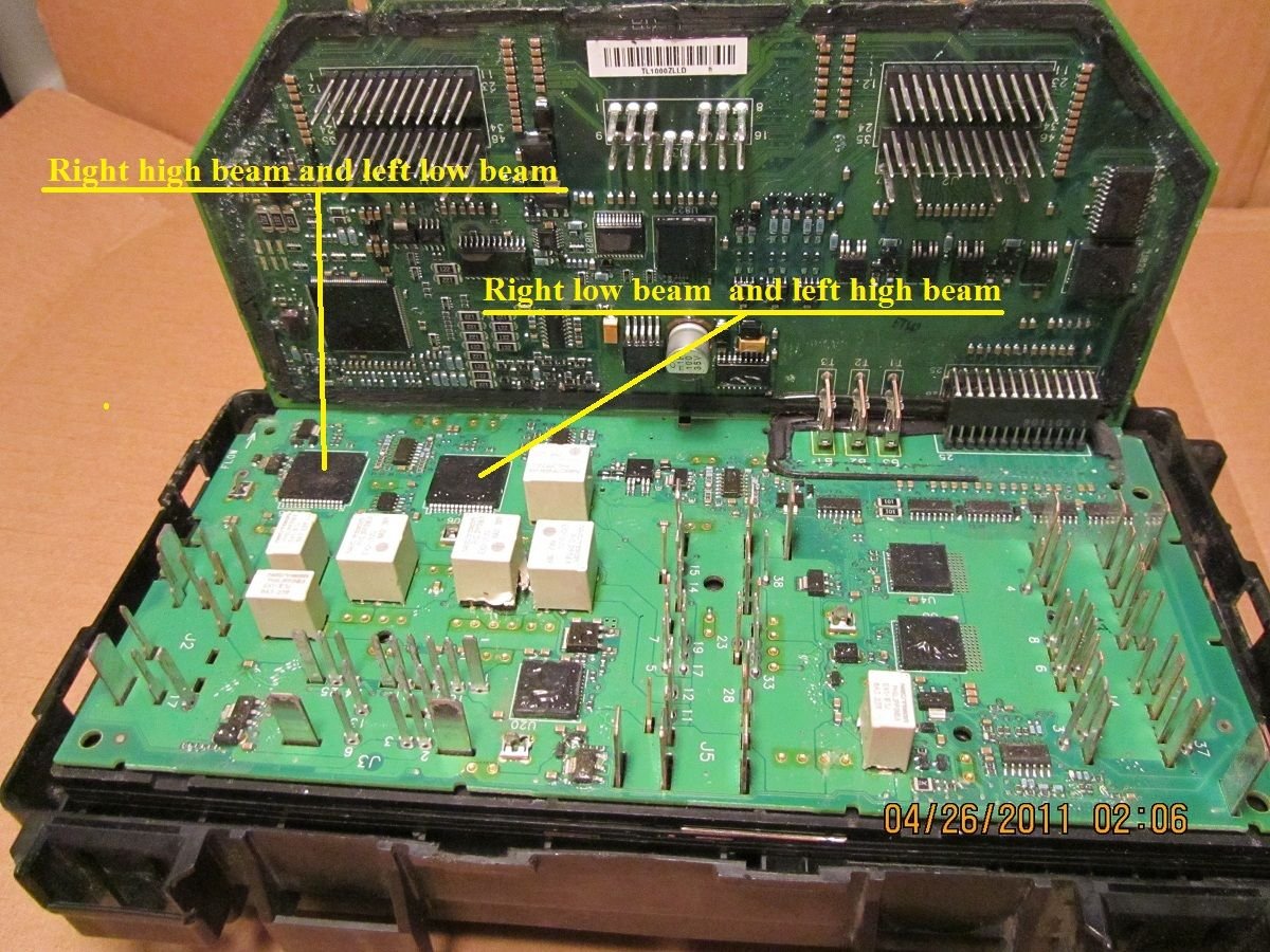 Here's a picture of the drivers that control the headlights. Since both headlights behave the same, the problem must be with whatever tells them what to do.