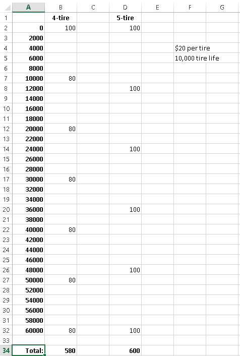 Quick spreadsheet check assuming 20 bucks per tire and 10k tire life. Both start with 5 tires.