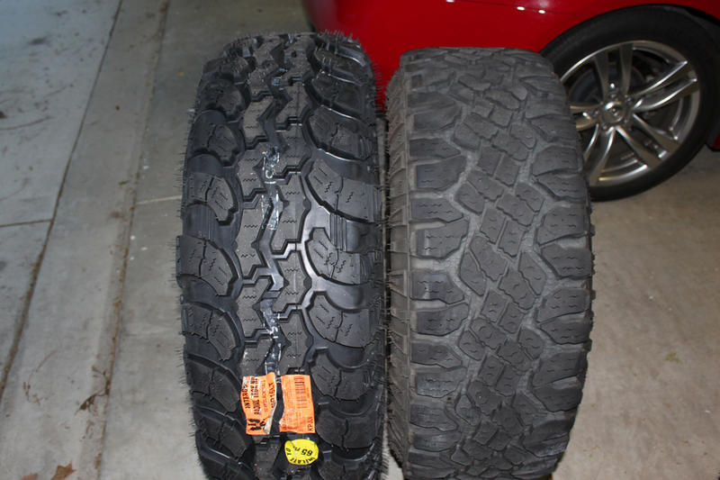 Here they are next to a 315/75R16 (35") Duratrac and what they looked like with a 3" FT lift and flats.