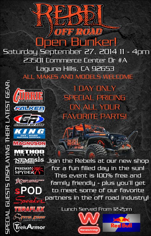 Are you free September 27th? Well, open up your calendar, mark the date, and head over to the new “Bunker”. Rebel Off Road is moving and they want to celebrate their new facility with an Open Bunker day. Here are the details.