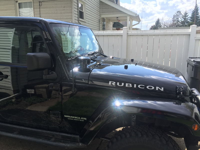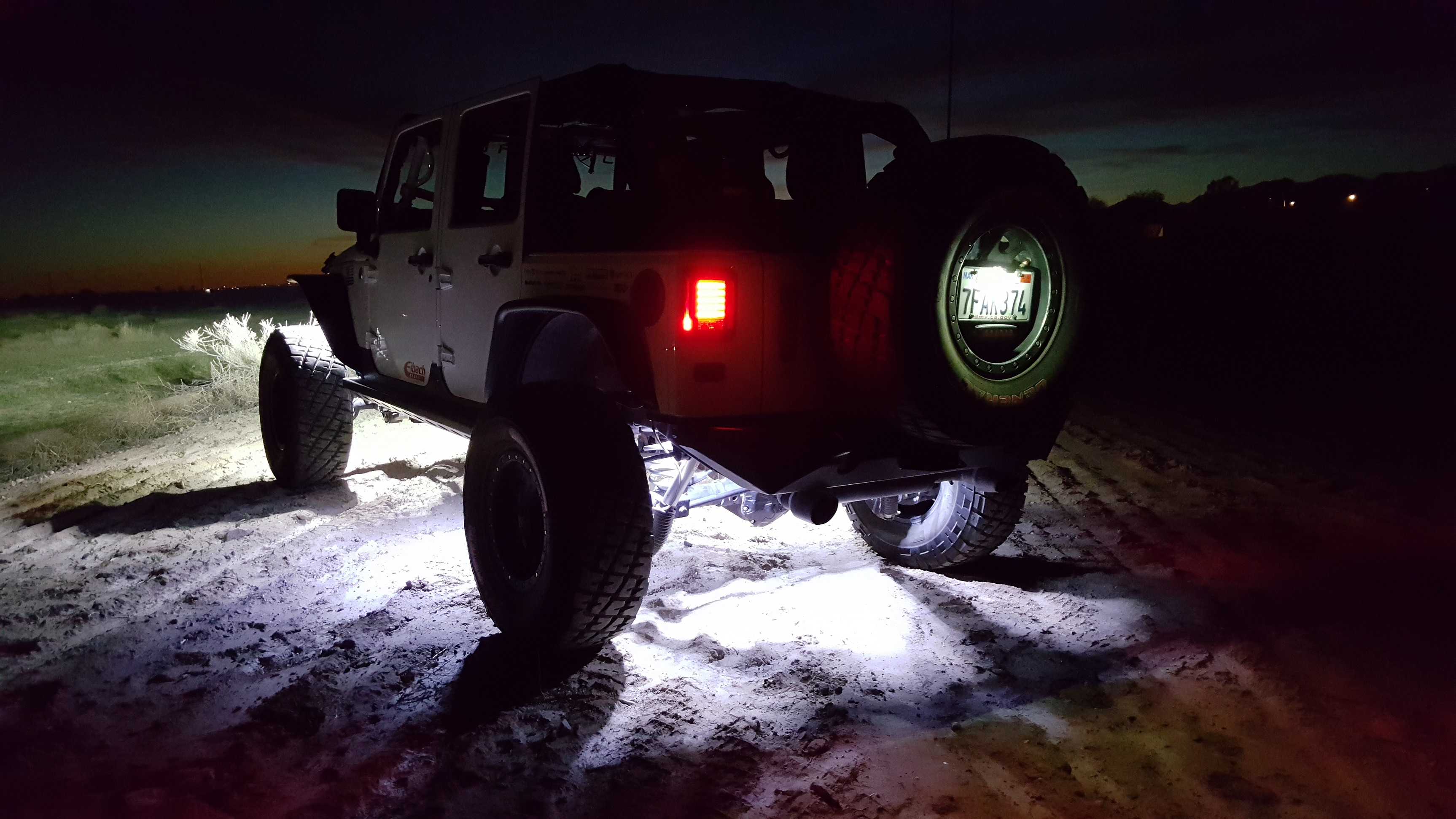 Since I had to move the switches up and had to do a bunch of re-wiring, I decided to add some more rock lights. Plus I am planning on a night run during EJS in a couple of weeks! I already had 4 KC Cyclone LEDs (1 at each corner) but decided to add 4 more. I added 2 under the front bumper and 2 inside the PS Brawler Rockers (because they have cool round holes already cut in them).
