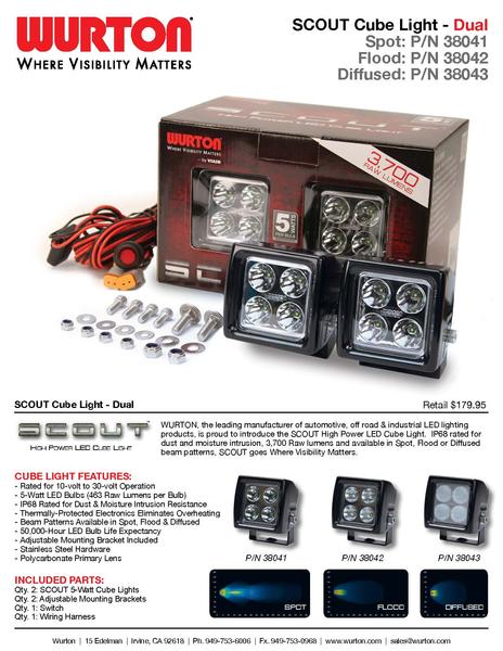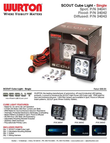 WURTON, the premier manufacturer of Automotive, Off Road & Industrial LED lighting products, is proud to introduce the SCOUT High Power LED Cube Light. IP68 rated for dust and moisture intrusion, available in Spot, Flood or Diffused beam patterns, single (1850 Raw Lumens) and dual packs (3700 Raw Lumens), these compact yet powerful lights provide industry leading performance and value. With a compact 3”x 3” housing , the Scout Cube light offers extreme versatility for numerous applications. SCOUT goes Where Visibility Matters.